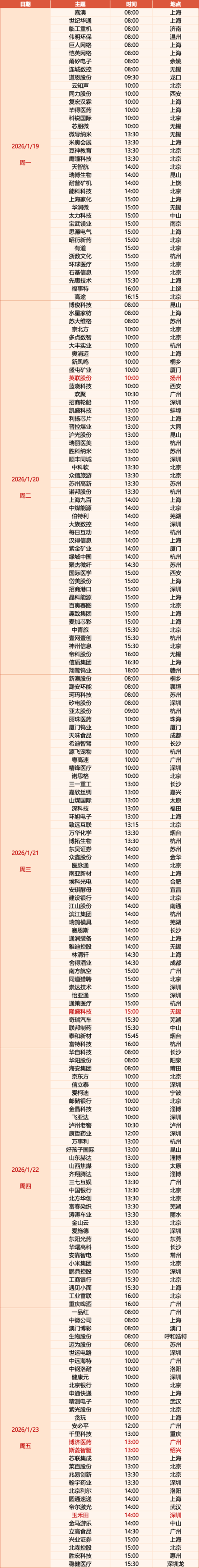 2026年1月19日-23日,市场调研活动将迎来密集期,200余家上市公司将接待机构调研,覆盖全国20余个省市及香港、澳门地区,涉及科技、医药、消费、制造等多个核心赛道。本次调研呈现区域集中度高、行业热点鲜明的特点,既反映了机构对经济核心区优质企业的关注,也凸显了当前产业发展的主流方向。
